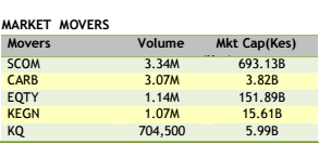 Trading activity started the week on a lower note as total turnover dropped to Kes 255mn with 12mn shares changing hands. Foreign investors’ demand stood at 58% while local investors’ supply was recorded at 66% of the total turnover respectively. Safaricom, Carbacid, Equity bank, Kengen and Kenya Airways moved the most shares. The NSE 20 Share Index slid to 3,907.09 points while the all share index was down too to 146.31 points.