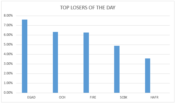 Eaagads Ltd was the top loser of the day. The company lost 7.61 percent at the price of 21.25 shillings per share. Olympia came in second by losing 6.33 percent at the price of 3.70 shillings per share. Sameer Africa Ltd, Standard Chartered Bank Ltd and Home Africa Ltd each lost 6.25, 4.88 and 3.57 percent respectively at the price of 3.00, 195.00 and 1.35 shillings per share as shown below: