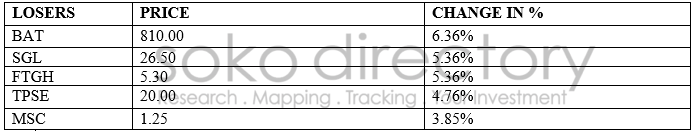 British American Tobacco was the top loser of the day with 6.36 percent at the price of 810.00 shillings per share followed by Standard Group with a loss of 5.36 percent at the price 25.50 shillings per share. See the table below: