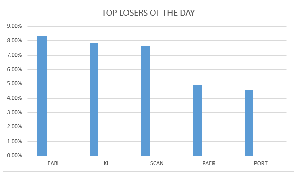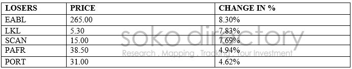 East African Breweries was the top loser of the day with 8.30 percent at the price of 265.00 shillings per share followed by Longhorn Kenya with a loss of 7.83 percent at the price 5.30 shillings per share. See the table below: