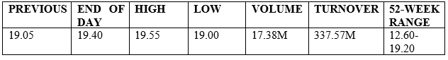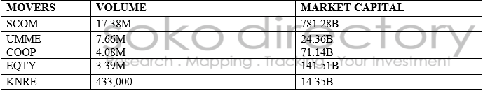 The table below shows the most traded in shares of the day led by Safaricom Ltd which posted a volume of 17.38 million and a market capital of 781.28 billion: