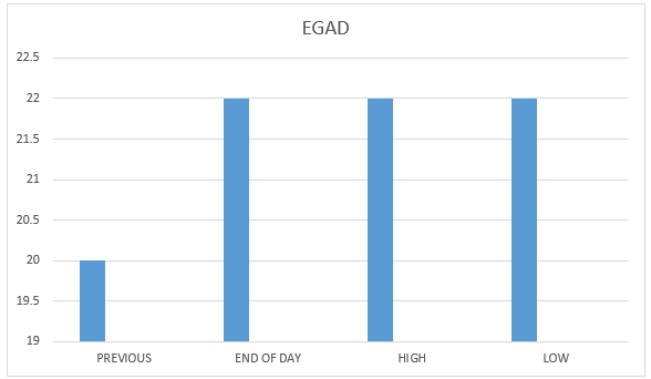 Eaagads had a volume of 100, a total turnover of 2,200.00 and its 52-week range stands at 18.00-30.00