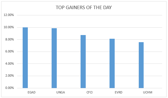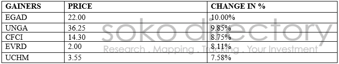 Eaagads was the top gainer at the NSE on Friday. The company gained 10.00 percent at the price of 22.00 shillings per share. Unga Limited came in second with 9.85 percent at the price of 36.25 shillings per share.