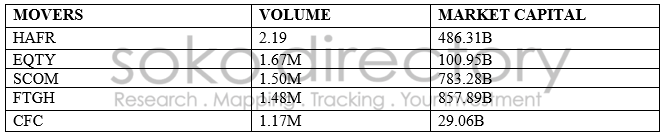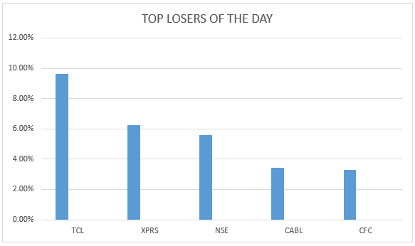 Trans-Century was the top loser of the day with 9.62 percent at the price of 9.40 shillings per share followed by Express with a loss of 6.25 percent at the price 3.00 shillings per share.