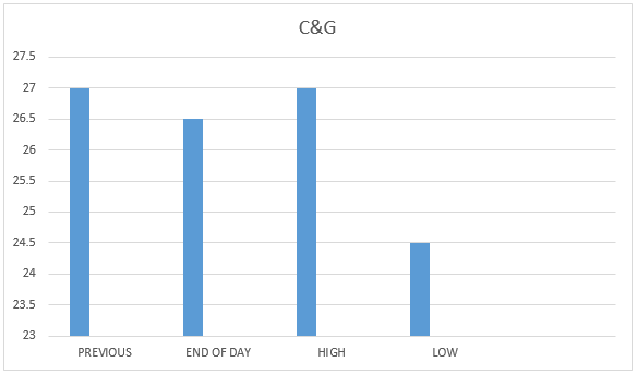 Car and General (K) had a volume of 1,800 and a total turnover of 48,100.00 while its 52-week range stands at 27.00-43.75.