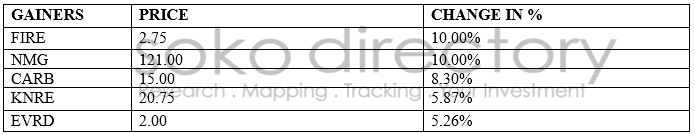 Sameer Africa was the top gainer at the NSE on Monday. The company gained 10.00 percent at the price of 2.75 shillings per share tying at the same position with Nation Media Group came in second with 10.00 percent at the price of 121.00 shillings per share.