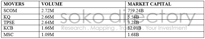 The table below shows the most traded in shares of the day led by Safaricom Limited which posted a volume of 2.72 million and a market capital of 759.24 billion: