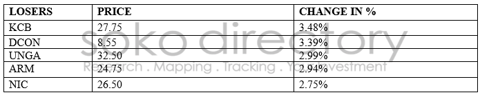 Kenya Commercial Bank was the top loser of the day with 3.48 percent at the price of 27.75 shillings per share followed by Deacons (East Africa) with a loss of 3.39 percent at the price 8.55 shillings per share.