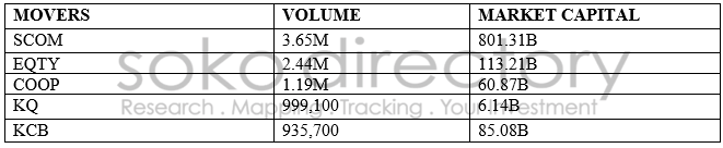 Kenya Commercial Bank had a volume of 109,000 and a total turnover of 3.14M while its 52-week range stands at 22.50-46.00.