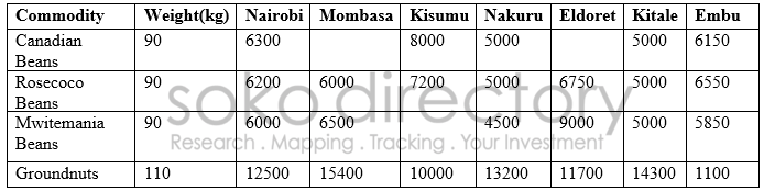 A 110-kilogram bag of Groundnuts on the other hand were being sold as follows in selected towns across the country; 15,400 shillings in Mombasa, 14,300 shillings, 13,200 shillings in Nakuru, 12,500 shillings in Nairobi, 11,700 shillings in Eldoret, 10,000 shillings in Kisumu and 1,100 shillings in Embu.