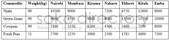 The table below represents a summary of the market prices for Njahi, Green Grams, cowpeas and fresh peas in various towns across the country: