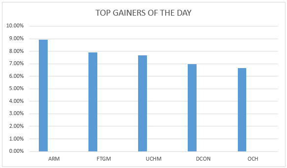 ARM Cement emerged as the top gainer of the day on Tuesday. The company gained 8.91 percent at the price of 27.50 shillings per share followed by Flame Tree Group with a gain of 7.92 percent at the price of 5.45 shillings per share.