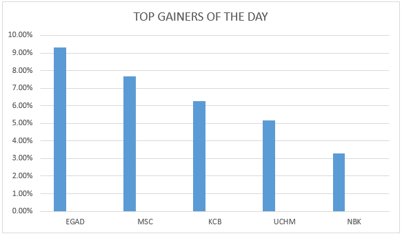 Eaagads was the top gainer of the day at the NSE on Wednesday. The company gained 9.30 percent at the price of 19.40 shillings per share followed by Mumias Sugar Company with a gain of 7.69 percent at the price of 1.40 shillings per share.