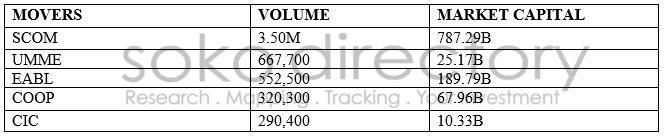 Kenya Commercial Bank came in third with 6.25 percent at the price of 29.75 shillings per share. Uchumi Supermarket and National Bank of Kenya gained 5.17 and 3.27 percent respectively at the price of 3.05 and 7.90 shillings per share respectively.