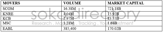 Standard Chartered Bank came in third with 2.22 percent at the price of 184.00 shillings per share. Sameer Africa and CIC Insurance Group gained 1.82 and 1.30 percent respectively at the price of 2.80 and 3.90 shillings per share respectively.