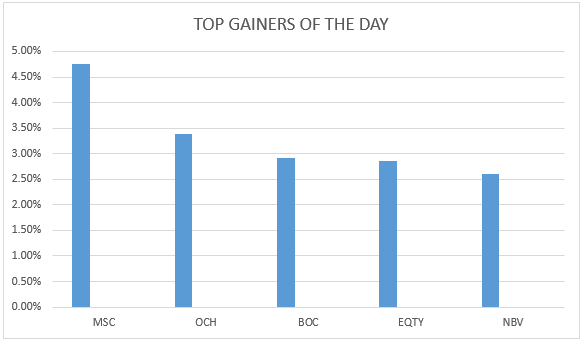 Mumias Sugar Company was the top gainer of the day at the NSE on Friday. The company gained 4.76 percent at the price of 1.10 shillings per share followed by Olympia Capital with a gain of 3.39 percent at the price of 3.05 shillings per share.