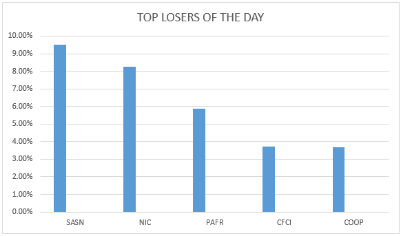 Sasini Tea and Coffee was the top loser of the day. The company lost 9.50 percent at the price of 18.10 shillings per share.