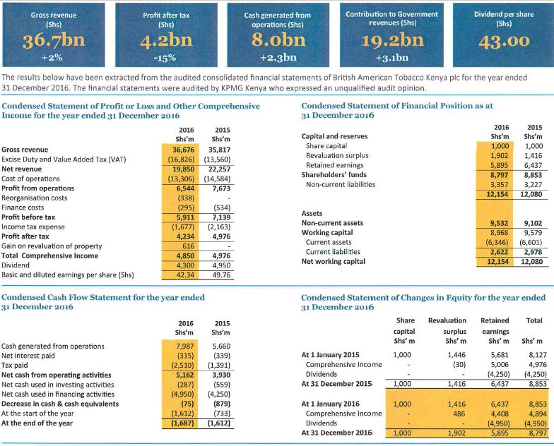 British American Tobacco has released its 2016 Financial Year results posting 4.2 billion shillings in terms of profits after tax, 15 percent lower than what was realized in the year 2015.
