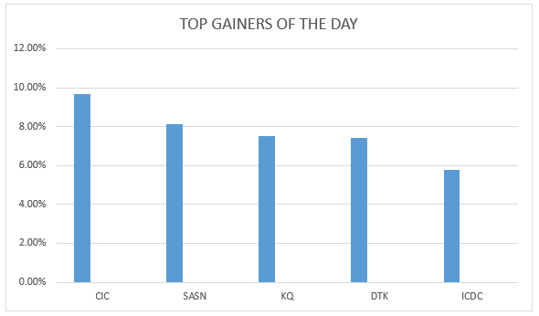 CIC Insurance Group was the top gainer of the day at the NSE on Thursday. The company gained 9.68 percent at the price of 3.40 shillings per share followed by Sasini Tea and Coffee with a gain of 8.11 percent at the price of 20.00 shillings per share.