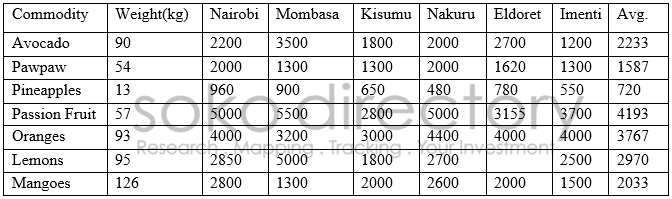 There is plenty of mangoes in the market since this is the season for harvest for the fruit. A 126 bag of mangoes was retailing highest in Nairobi at 2,800 shillings and lowest in Mombasa at 1,300 shillings. Here is a summary of a number of different fruits available in the market across different towns in the country: