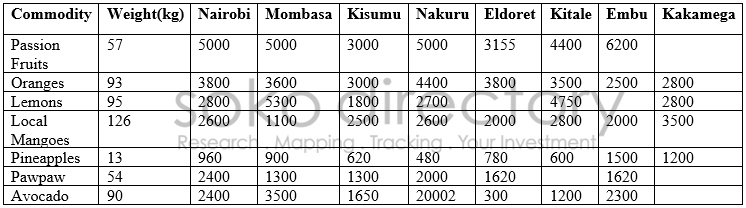 The fruits market too is performing averagely in terms of market prices and a variety of different fruits are available in some town. A 57-kilogram bag of passion fruits is retailing as follows: 6,200 shillings in Embu, 5,000 shillings in Nairobi, Mombasa and Nakuru respectively, 4,400 shillings in Kitale, 3,155 shillings in Eldoret and 3,000 shillings in Kisumu.