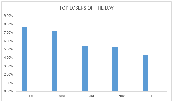 Crown Berger, Nairobi Business Ventures, and Centum Investment Company lost 5.45, 5.30 and 4.29 percent respectively as shown in the image below: