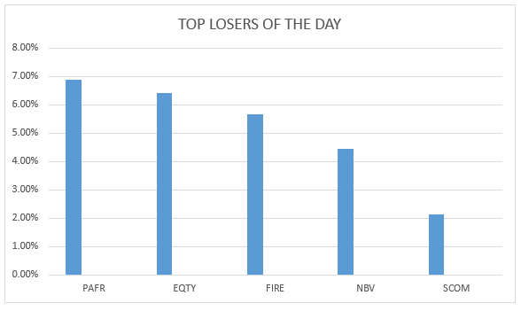 The top loser of the day was Sanlam Kenya with 6.90 percent at the price of 6.41 shillings per share followed by Equity Group which lost 6.41 percent at the price of 36.50 shillings per share.