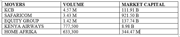 The table below shows the most traded in shares of the day led by Kenya Commercial Bank which posted a volume of 4.57 million and a market capitalization of 111.91 billion shillings: