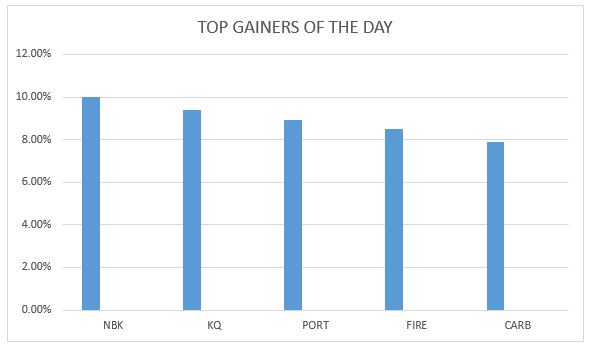 The top gainer of the day on Thursday at the NSE was National Bank of Kenya with 10.00 percent at the price of 9.95 shillings per share followed by Kenya Airways with a gain of 9.38 percent at the price of 5.25 shillings per share.