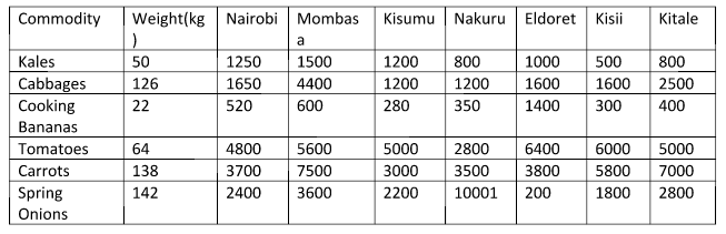 A 126-kilogram bag of cabbages, on the other hand, was being sold as follows: 4,400 shillings in Mombasa, 2,500 shillings in Kitale, 1,650 shillings in Nairobi, 1,600 shillings in Eldoret and Kisii respectively and 1,200 shillings in Kisumu and Nakuru respectively.