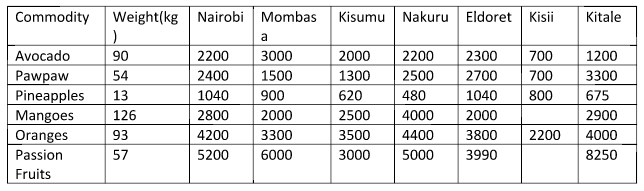 A 126-kilogram bag of mangoes was being sold as follows: 4,000 shillings in Nakuru, 2,900 shillings in Kitale, 2,800 shillings in Nairobi, 2,500 shillings in Kisumu 2,000 shillings in Mombasa.