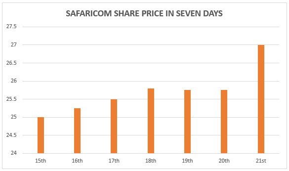 From the image above, the share price of Safaricom has been rising, reaching its all-time high of 27 shillings per share on 21st November 2017.
