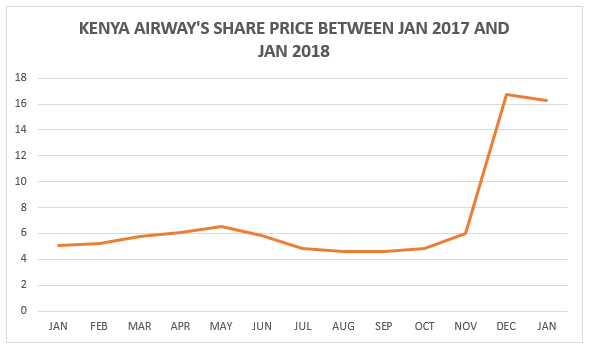 The image below shows the share price of Kenya Airways per month from January 2017 to January 2018: