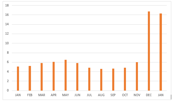 The bar graph below shows the share price of Kenya Airways between January 2017 and January 2018: