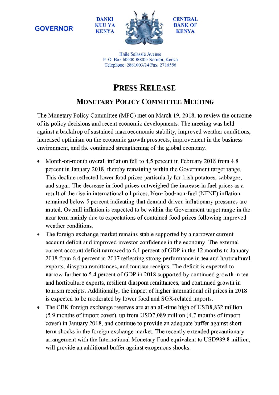 “The MPC noted that inflation expectations were well anchored within the Government target range, the increased optimism for growth prospects in the economy and that the economic output was below its potential level,” read the statement from CBK.
