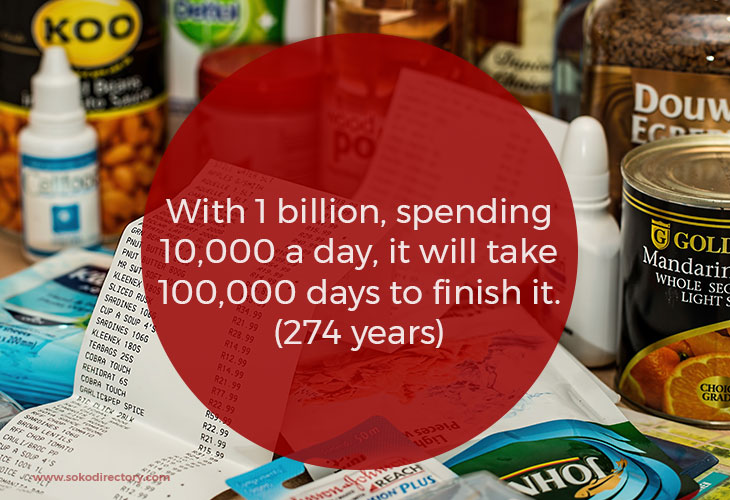 If you are given one billion shillings, and you start using 10,000 shillings daily, you will use it for 100,000 days roughly 274 years to finish it. Now, if you have 40 billion shillings, using 10,000 a day, it will take you 10,960 years to finish the money.