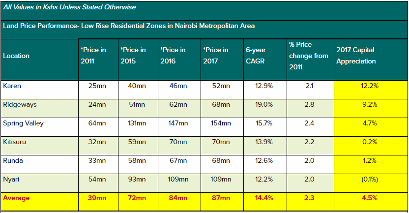 Karen recorded the highest appreciation rates of 12.2 percent against a submarket average of 4.5 percent attributed to its affordability as compared to other low rise residential nodes, with an average price per acre of land in Karen being 52 million shillings against a market average of 87 million shillings for the low rise residential nodes.