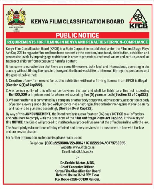 Five days remaining for all filmmakers within Kenya to obtain filming licenses.