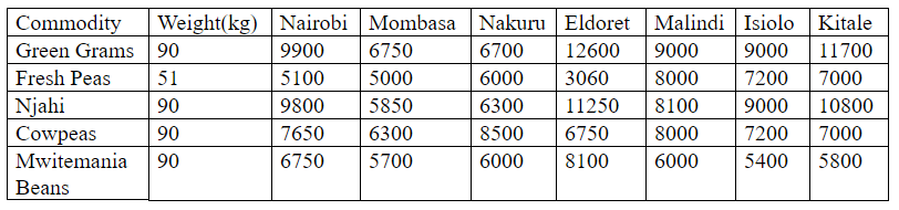 A 98-kilogram bag 0f Sweet Potatoes, on the other hand, was retailing as follows: 3,600 shillings in Malindi and Isiolo respectively, 3,200 shillings in Nairobi, 3,000 shillings in Kisumu, 2,900 shillings in Mombasa, 2,500 shillings in Eldoret and 2,000 shillings in Kitale.
