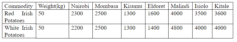The potato market had a variety of different prices in selected towns with a 50-kilogram bag of White Irish Potatoes being sold highest in Malindi at 4,000 shillings and lowest in Kisumu at 1,300 shillings.
