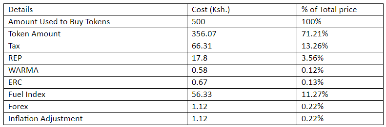 The first purchase he made was in March 3rd, 2018 and with 500 shillings, the number of tokens or units he received was 32.1. Then, there was no breakdown of the other charges on the message but the new change details how the billing process works. This amount was after he had paid the standing charges of 150 shillings.