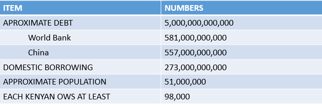 Kenya used to be a working nation, graduated downwards to a walking nation and now it is a borrowing nation. Our leaders are borrowing left, right and center without giving a damn of the consequences the massive borrowing has to the economy.
