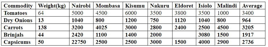 This can be seen from a spot check on a number of selected towns across the country that showed a 64-kilogram bag of tomatoes retailing averagely at 3,400 shillings, with the highest market price being 6,000 shillings in Kisumu and the lowest being 1,000 shillings in Malindi.