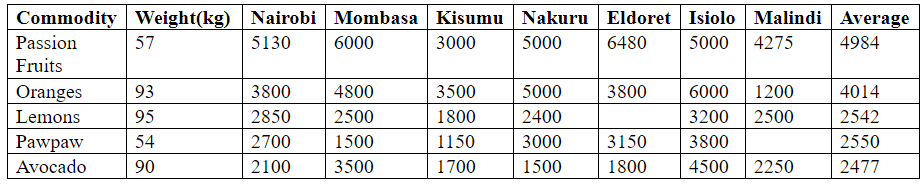 The table below gives a summary of market prices for a variety of fruits in selected towns across the country: