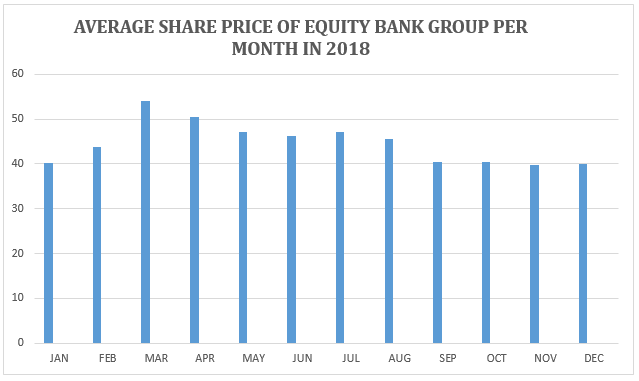 The shares of KCB Group averaged 44.15 shillings per share in 2018, just a few cents away from Equity Bank Group. The share hit the highest March at 53 shillings per share followed by the month of April at 47.75 shillings per share.