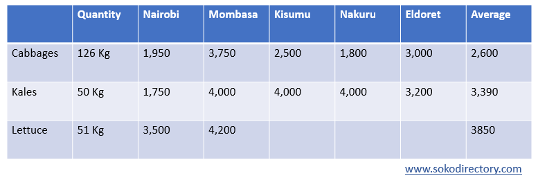 Nairobi recorded the lowest price of cabbages, where a 126 Kg bag is being sold at a market price of 1,950 shillings while Mombasa recorded the highest market price of 3,750 shillings.