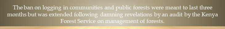 The audit by the Kenya Forest Service revealed illegal logging by state officers prompting the government to further extend the logging ban as the consequences were beginning to be felt.