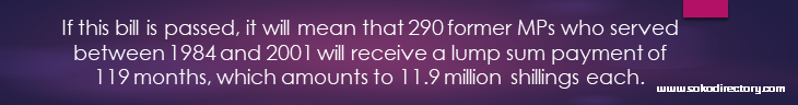 The bill also proposes that the 80 former MPs who have been exempted from pension receive 120,000 shillings monthly to lift them up from poverty, and should be backdated to January 2010.
