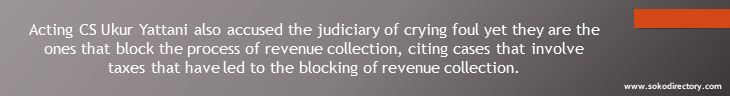 “The only way the government acquires revenue is through the collection of taxes and the judiciary knows this. Yet when we follow up organizations and people who have not been tax compliant, they run to the court, which in turn stops us from continuing our operations. It is the slow conclusion of petitions at the judiciary that stands in the way of tax collection,” said the CS.
