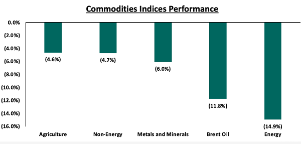 The agriculture, non-energy commodities, metals & minerals, and Brent oil registered declines of 4.6, 4.7, 6.0, and 11.8 percent, respectively.